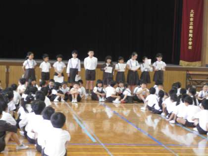 今日の児童集会は、1年生紹介でした。集会委員会の人から、一人ずつ名前を呼ばれて大きな声で返事できました。続いて、1年生クイズでした。