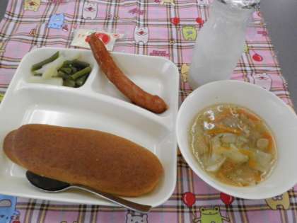 献立は、ウィンナーのケチャップソース・スープ・じゃがいもとさんど豆のサラダ・ライ麦パンでした。
