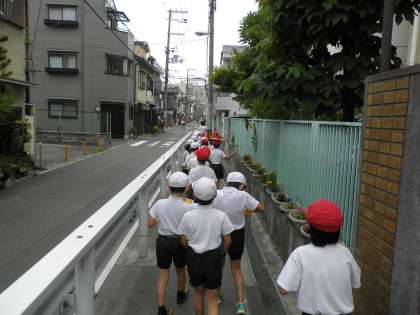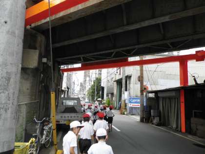 雨が心配でしたが,校区地図と探検バックを持って,校区探検に行ってきました。まず,学校前の「南市岡銀座通り」を西に向かって進みました。子ども110番のお家の前で,おじさんのお話を聞きました。