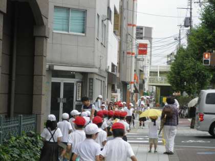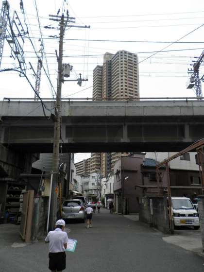 JR環状線のガードをくぐって,港通りに出ました。バス通りは色々なお店がありました。郵便局もありました。ガソリンスタンドのところをまがって,またガードをくぐると,3丁目のキングマンションが見えてきました。