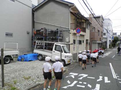 心配していた雨は,ぎりぎりセーフでした。学校に戻って,みんなが発見したことを書き込んで,大きな「南市岡校区探検地図」を作っています。