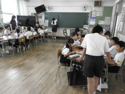たてわり班ごとに集まって、「ふれあいフェスティバル」で行うお店の出し物を相談しました。6年生のリーダーが、1年生にわかりやすく説明していました。