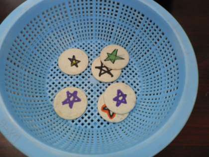 牛乳キャップの裏に描いた絵柄の種類で得点が違います。どこにあるかな?