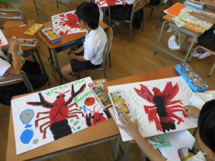 大事に飼っているいるザリガニの絵を描きました。ザリガニはパスを使って大きなハサミから描きだしました。絵の具を使って水の中を表現しました。