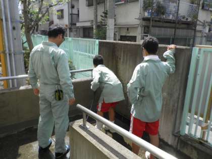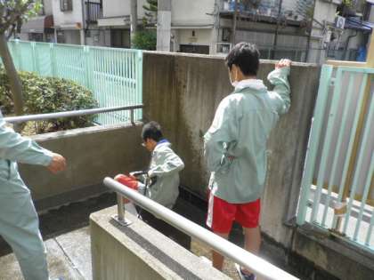 今日は、管理作業員さんと高圧洗浄機を使って、地域門のスロープをきれいにしてくれました。汗びっしょりでしたが、高圧洗浄機の使い方がかっこよかったです。