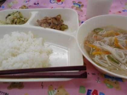 14日:豚肉とピーマンの生姜焼き、にゅうめん、切り干し大根の梅風味、ごはん、牛乳