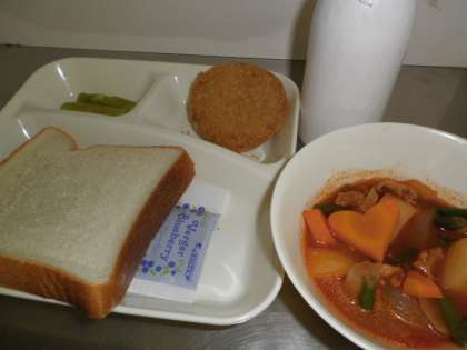 15日:チキンレバーカツ、ケチャップ煮、グリーンアスパラガスのサラダ、食パン、ブルーベリージャム、牛乳