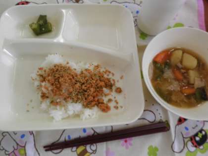 1学期最後の給食献立は、豚肉とじゃがいもの煮物、オクラの甘酢あえ、紅ざけそぼろ、ごはん、牛乳でした。みんなおいしくいただきました。