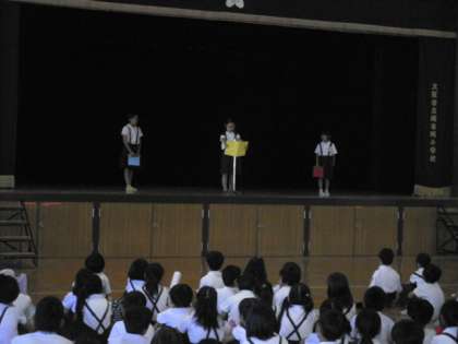 1学期の終業式を行いました。校長先生のお話、夏休みの生活についての話、プール開放の話を静かに聞くことができました。その後、1年1組・3年1組・5年1組の代表の児童が、1学期の思い出や夏休みにしたいことなどを発表しました。話す態度も聞く態度も素晴らしく、みんなの成長を感じられた終業式でした。