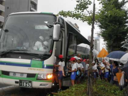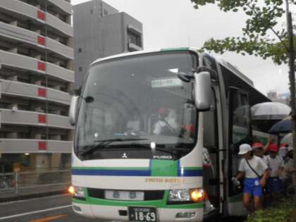 雨の中、バスに乗り込んで出発! 皆さん、元気に楽しい思い出をつくってきてください。 保護者の皆様、早朝から見送ってくださいましてありがとうございました。林間学習の活動の様子は、随時ホームページでお知らせする予定ですので、ご覧ください。