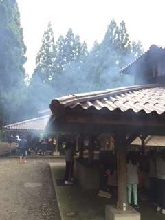 雨はあがりましたがマキが湿気てるのですごい煙です