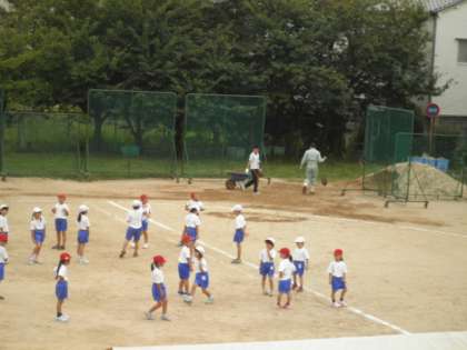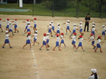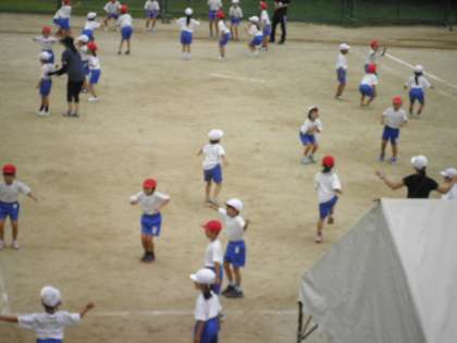 午前中の体育の時間、運動会に向けて練習しています。2年生と一緒に団体演技の場所移動・・・しっかり覚えてね。雨上がりの運動場奥では、ぬかるみに土をまく職員の姿が・・・運動会が成功するようにみんなで応援しています。