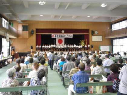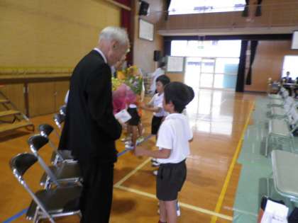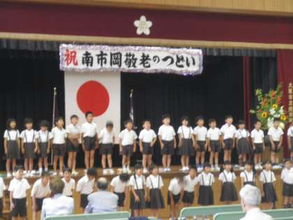 9月19日に南市岡地域活動協議会主催の「敬老の集い」が開催されました。雨が降る中、たくさんの方が来てくださいました。学校を代表して2年生児童が、金婚式のお祝いの花束贈呈の役を務め、敬老のお祝いの言葉・合唱合奏を披露しました。