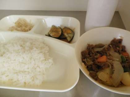 献立は、肉じゃが・焼きなすのみそだれかけ・もやしのゆずの香あえ・ごはん・牛乳でした。