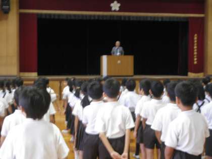 夜中に降った雨のため運動場が使えず、今日の児童朝会は講堂で行いました。休み明けのためか天候のせいか、少し体調を崩している児童がいるようです。早寝・早起き・朝ごはんをしっかり食べ、10月2日の運動会に向けて、元気にすごしましょう。