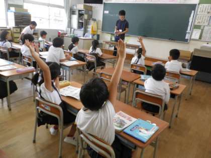2時間目、1年1組では実習生が算数の授業をしました。「どちらがおおい」の単元で、水のかさをくらべました。