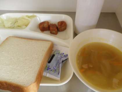 献立は、まぐろのオーロラ煮・スープ・サワーキャベツ・食パン・ブルーベリージャム・牛乳でした。