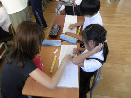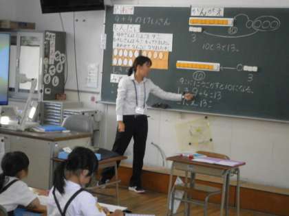 今日は1年生で内海先生の授業研究会をしました。大勢の先生に囲まれて子どもたちは少し緊張気味でしたが,しっかりと考えて学習できていました。全クラスが自習になるので,藤崎さんが校内を巡回しています。