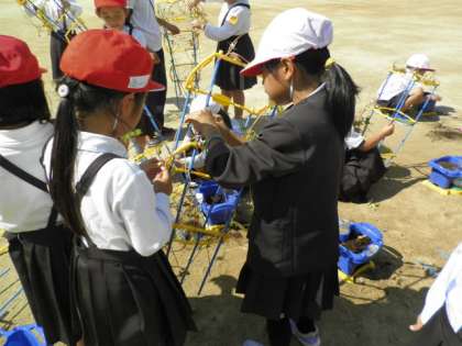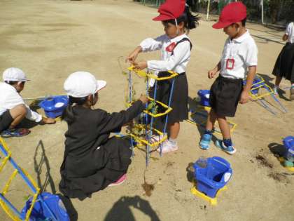 植木鉢の土に肥料を混ぜて、球根を植える準備をしています。1学期に植えたアサガオのつるが残っていて、これがまた思いのほか強くからまっていて子ども達はびっくり!友達と協力して取っていました。