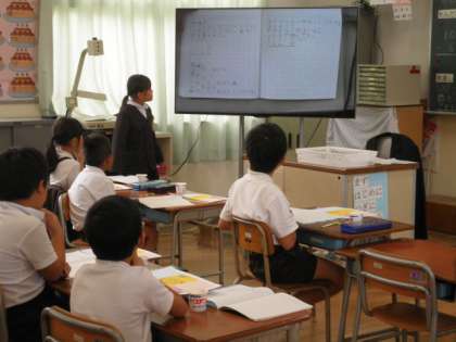 今日は2年2組で算数の授業研究会をしました。平田先生が「筆算のしかたを考えよう」というめあてで授業をし、子どもたちは数カードを使って、3桁のくり下がりのある計算のしかたを考えました。ペアで自分の考えを話したり、大型テレビを使って自分の考えをみんなに説明したりして、しっかりと学習することができました。