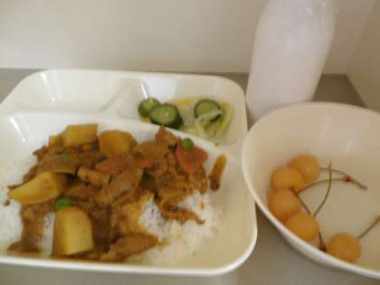 今日の献立は、ポークカレーライス(米粉)・野菜サラダ・さくらんぼ(缶)・牛乳でした。