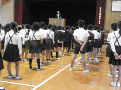 雨で運動場が使えなかったので、講堂で児童朝会をしました。校長先生が、土曜日に隣りの市岡小学校で100周年のお祝い行事があったこと、南市岡小学校はその市岡小学校から分離して開校されたことなどをお話しされました。