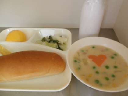献立は、コーンクリームシチュー[米粉]・キャベツと三度豆のサラダ・かき(平核無柿)・コッペパン・牛乳でした。