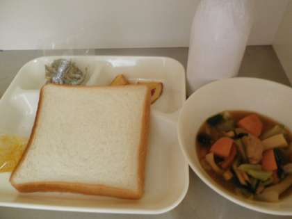 献立は、中華煮・大学いも・ミニフィッシュ・食パン・マーマレード・牛乳でした。