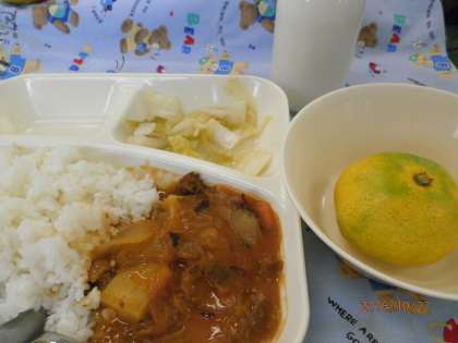 献立は、ハヤシライス・はくさいのピクルス・みかん・牛乳でした。