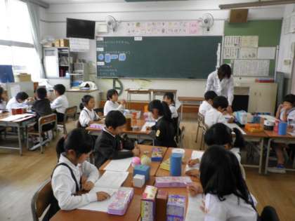 2時間目に山口先生の授業研究会をしました。1年生が算数科「かたちあそび」の学習に取り組み、しっかり考えて発表していました。他の学級は自習になるので、藤崎さんが巡回をしています。