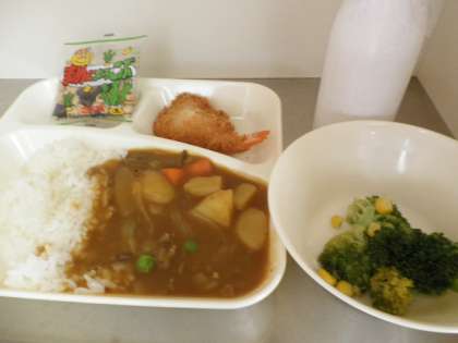 1日:エビフライカレーライス・ブロッコリーとコーンのサラダ・豆こんぶ・ごはん・牛乳