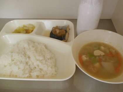 2日:さごしのおろしじゅうゆかけ・けんちん汁・はくさいのおひたし・ごはん・牛乳
