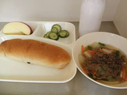 4日:肉うどん・あっさりきゅうり・りんご・レーズンパン・牛乳