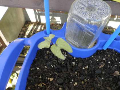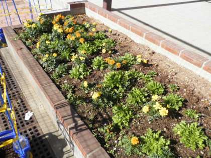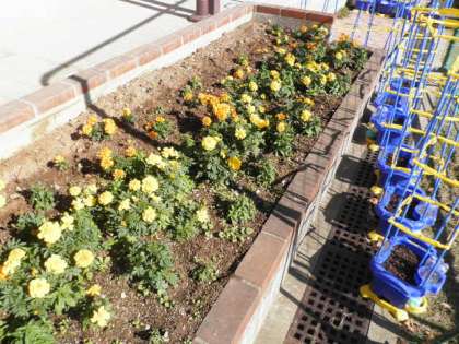 栽培同好会で植えたマリーゴルドが咲き始めています。1年生が植えたチューリップの鉢から朝顔の双葉が出てきました。不思議です。