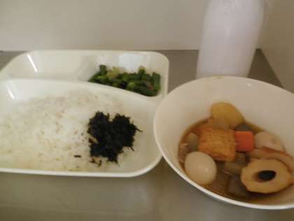 献立は、関東煮・さんど豆のからしあえ、のりのつくだ煮・ごはん・牛乳でした。