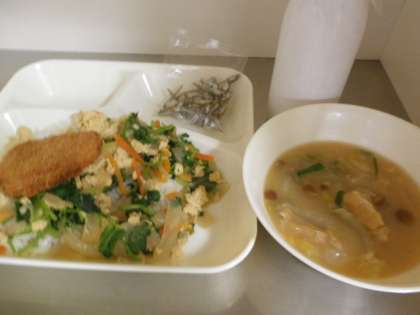献立は、カツ丼・なめこのみそ汁・ミニフィッシュ・牛乳でした。