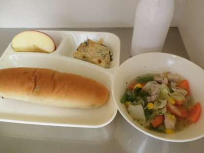 献立は、鶏肉と野菜のスープ煮・ほうれんそうのグラタン・レーズンパン・りんご・牛乳でした。