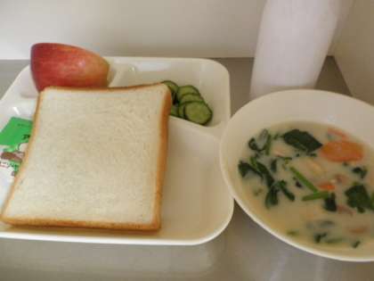献立は、ほたて貝のクリームシチュー・きゅうりのピクルス・食パン・マーガリン・りんご・牛乳でした。