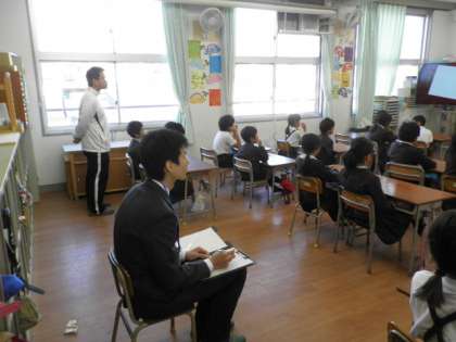 例年、小中学校の先生達共同の研修会を行っています。今日はその一つで、市岡東中学校の先生が、小学校の授業を見に来られました。