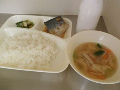 献立は、さばのみそ煮・五目汁・きくなとはくさいのおひたし・ごはん・牛乳でした。