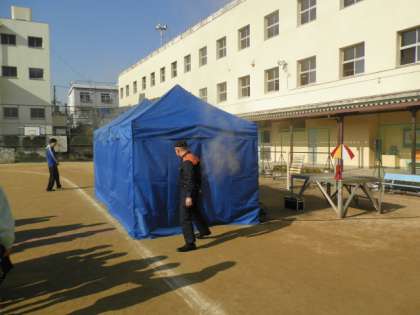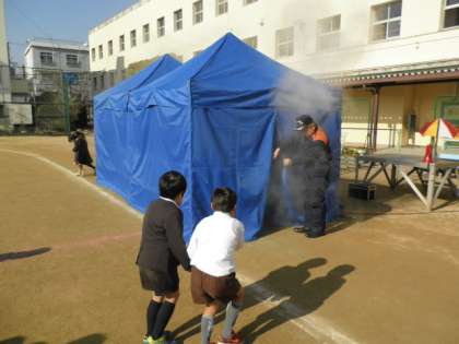 煙の中では何も見えません。保護者の方も体験してみてください。