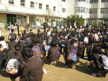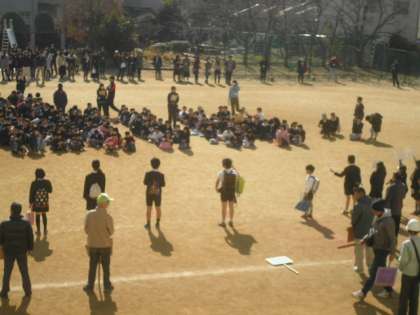 全校児童が運動場に集合し、校長先生のお話を聞きました。