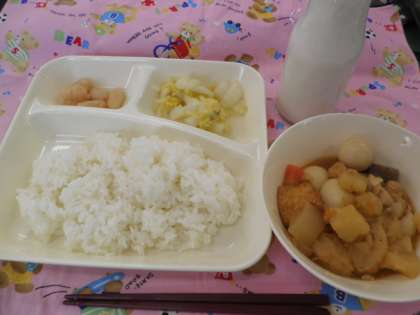 献立は、関東煮(うずら卵)・はくさいの甘酢づけ・大福豆の煮物・ごはん・牛乳でした。