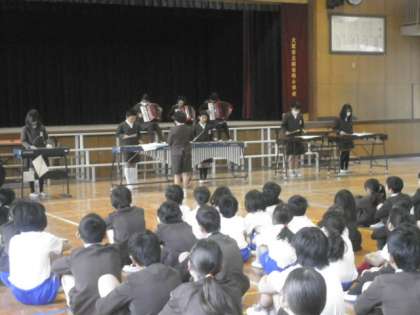 次に、音楽クラブが楽器の紹介をして、「となりのトトロ」を合奏しました。