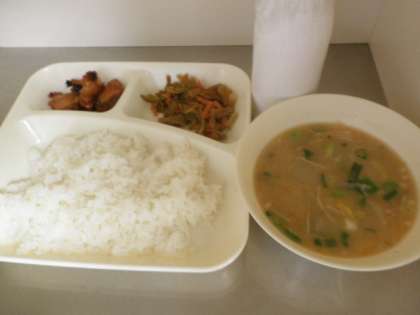 献立は、鶏肉の照り焼き、さつまいものみそ汁、きんぴらごぼう、ごはん、牛乳でした。