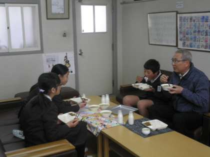 卒業前に校長先生と一緒に給食を・・・と、6年生がグループごとに校長室で給食を食べることになりました。今日は3人の子どもたち・・・緊張しているかな、と覗いてみると、笑い声をあげて楽しそうな様子。食器を片づけたあとも校長先生とのお話を楽しんでいました。