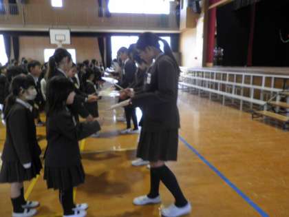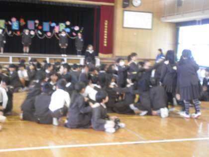 集会委員会を中心に、みんなで「じゃんけん列車」をしました。ふれあい班ごとに、6年生へメッセージを書いて渡しました。
