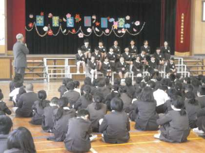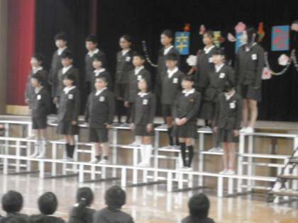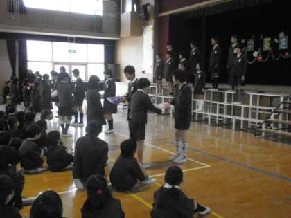 在校生が、「思い出のアルバム」の替え歌でお祝いをしました。6年生は合奏と歌のお返し、手作りぞうきんを各学級に贈りました。