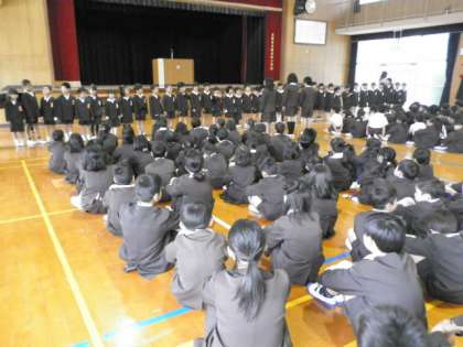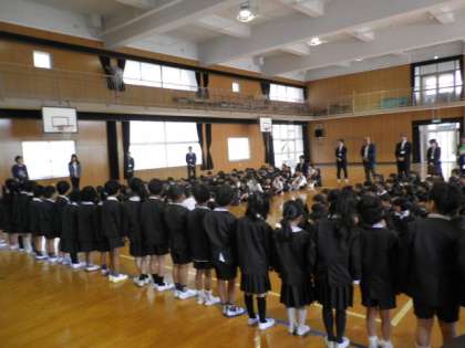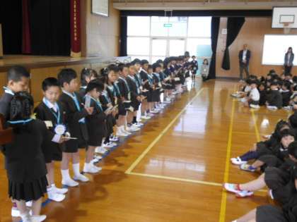 始業式に続いて1年生の対面式を行いました。児童会の代表から歓迎の言葉があり,2年生からはメダルとアサガオの種のプレゼントがありました。1年生は少し緊張していましたが,「よろしくおねがいします。」と声をそろえて挨拶が出来ました。