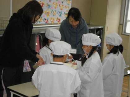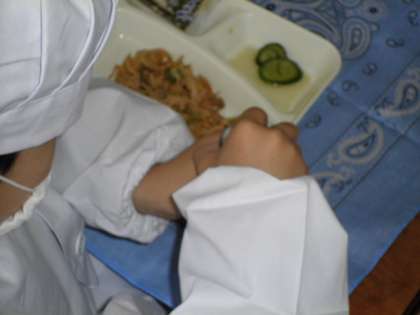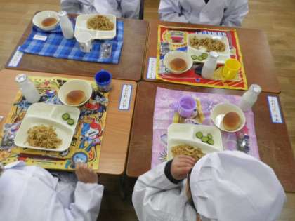 初めての給食です。今日のメニューは,焼きそばとパンです。牛乳のキャップを取るのに苦労していました。瓶詰の牛乳って,学校給食くらいなのでしょうか?